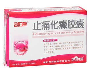 止痛化癥膠囊(金婦康) 0.3克×48片 通化茂祥制藥有限公司 國(guó)藥準(zhǔn)字Z22025500 活血調(diào)經(jīng)、殺菌消炎、止痛化癥、軟堅(jiān)散結(jié)。用于治療慢性盆腔炎、陰道炎、月經(jīng)不調(diào)、痛經(jīng)閉經(jīng)、白帶量多、子宮糜爛、色斑、腫塊、具有殺菌、消炎、止痛、化癥的療效。 口服,每日2-3次,每次4粒,2周一療程 全蝎、蜈蚣、魚(yú)腥草、三棱、丹參、當(dāng)歸、黃芪、延胡索等19味中藥精制而成。 本品為膠囊劑,內(nèi)容物為棕褐色或黑褐色顆粒,氣微香,味苦、微咸。 密封,置陰涼干燥處。